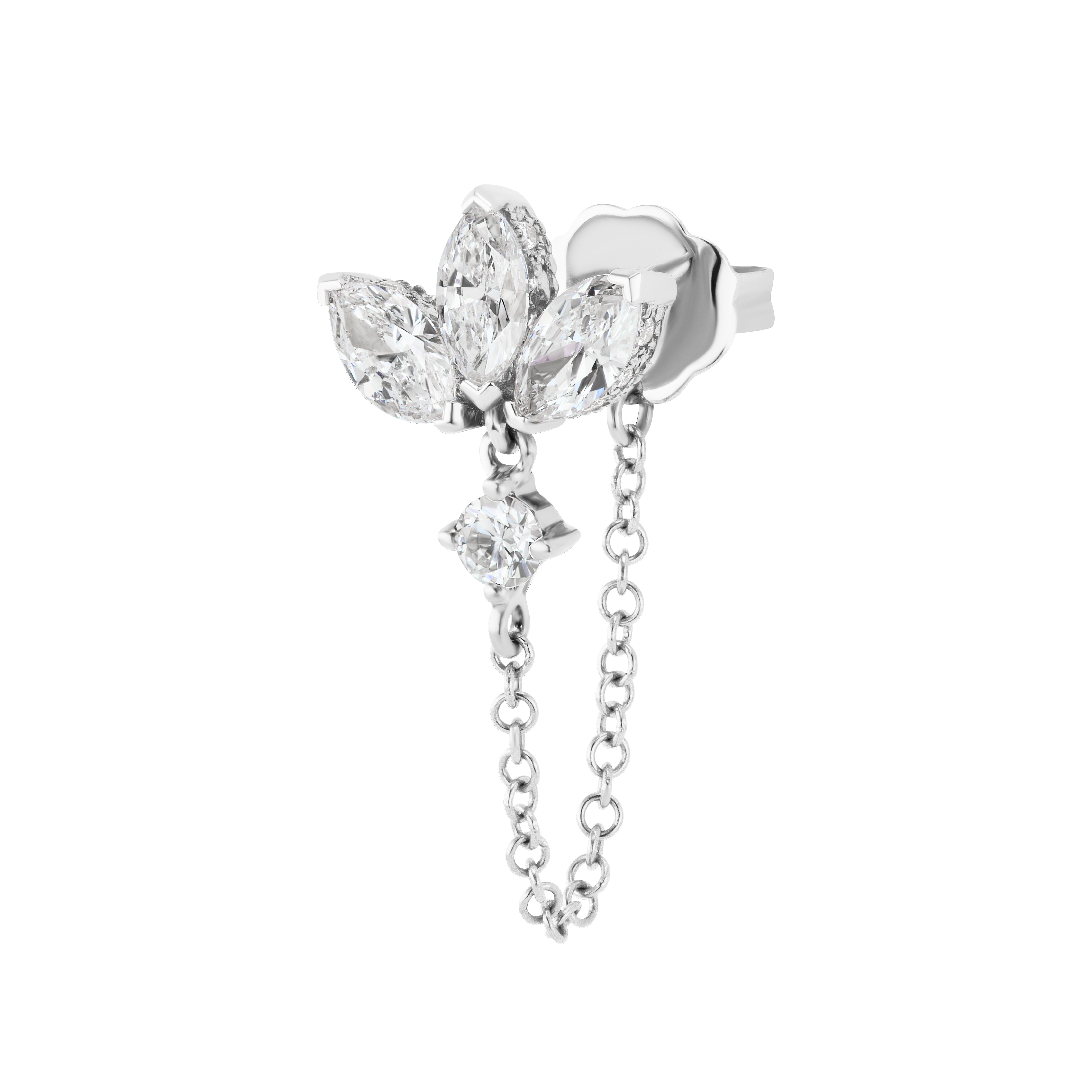 This large lotus centerpiece, crafted with three radiant marquise diamonds, is accented with a shimmering diamond dangle. A thin solid gold chain connects the bottom of this stud to a traditional earring back, allowing the chain to elegantly wrap around your ear. Dress this patented style in a Lobe piercing for optimal shine and movement.