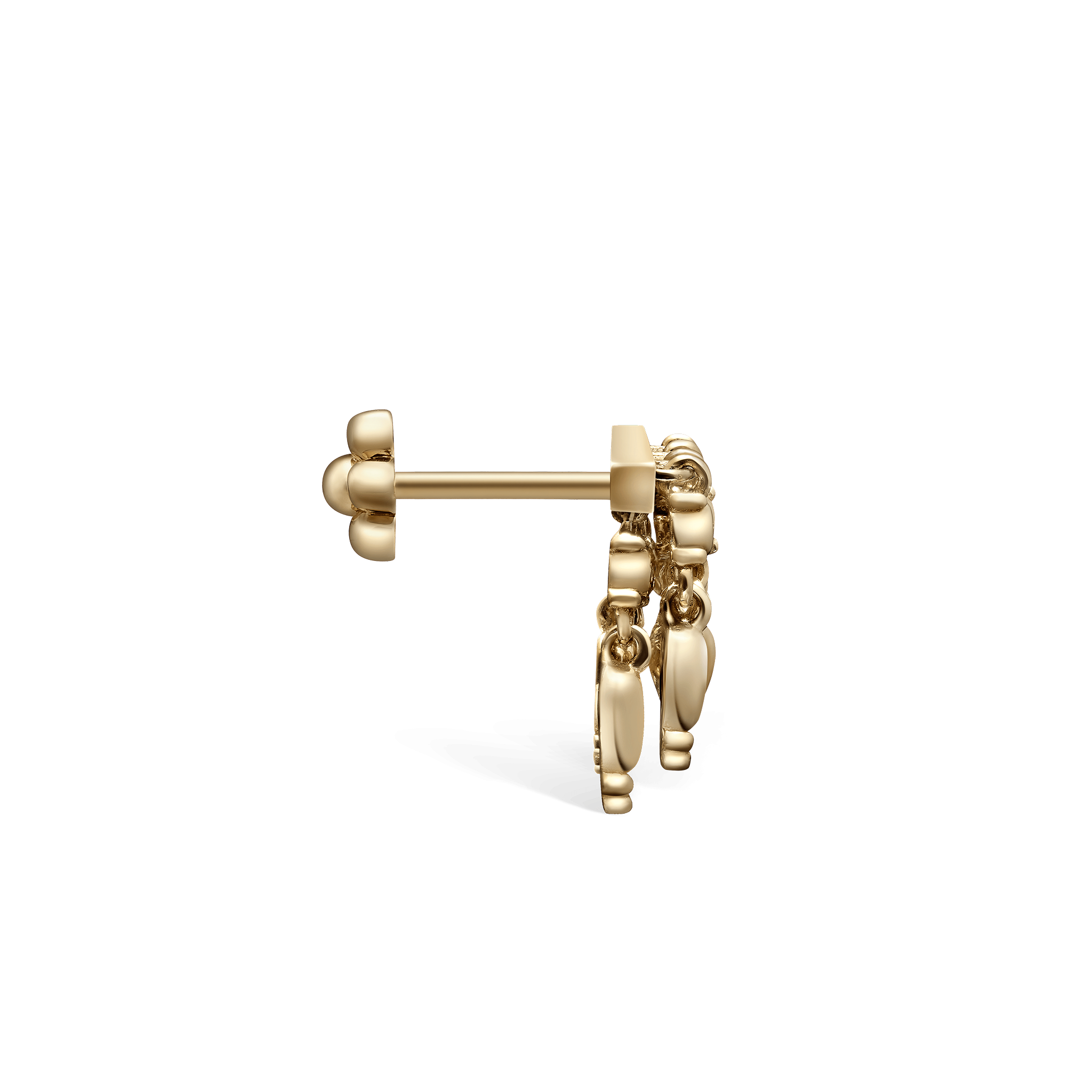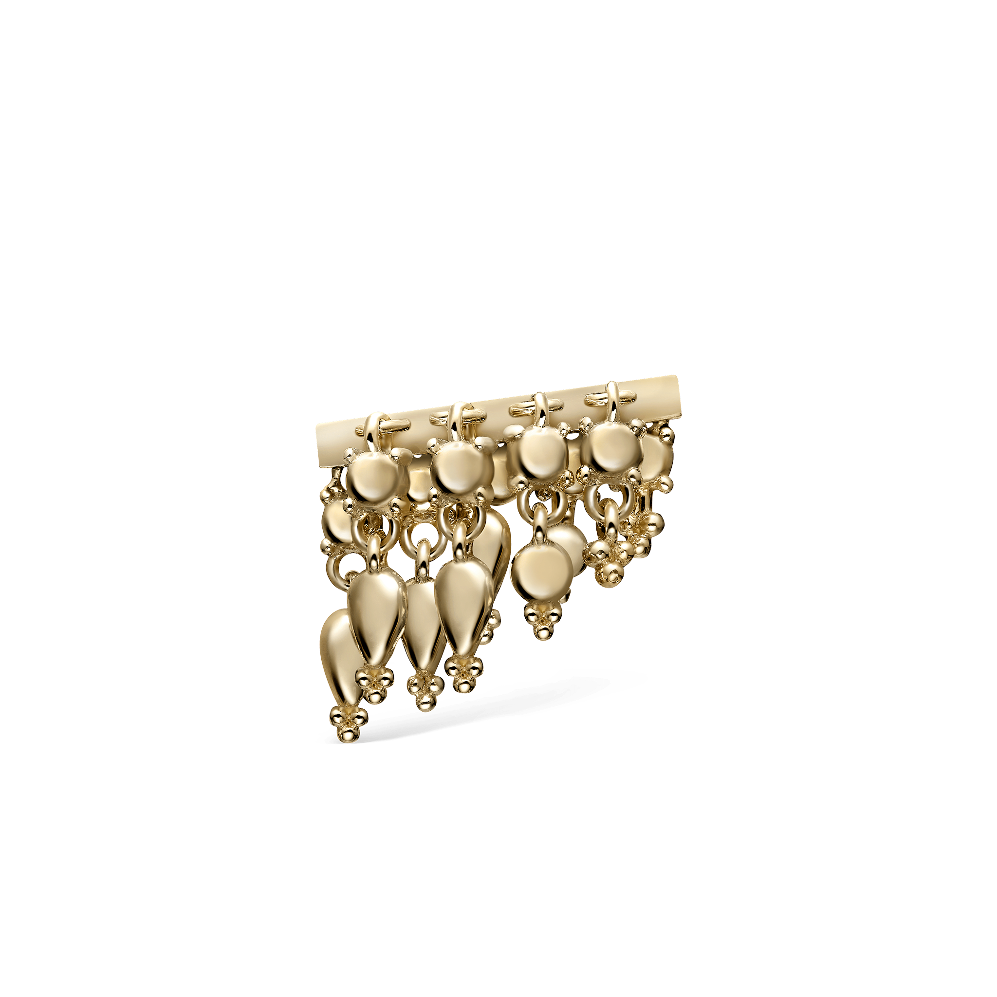 A structured bar stud with captivating movement featuring connected strings of solid gold tassels, with repeating pears and ball trinities, in the same proportions of our iconic gold tassel clickers. Tuck this patented piece under the fold of your Helix when worn in a Tash Rook for a dramatic faux industrial.