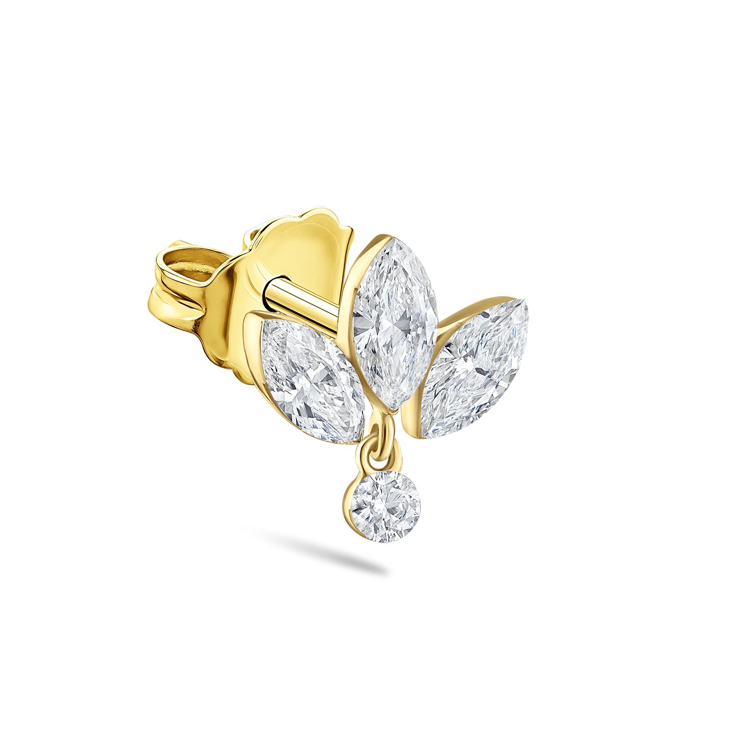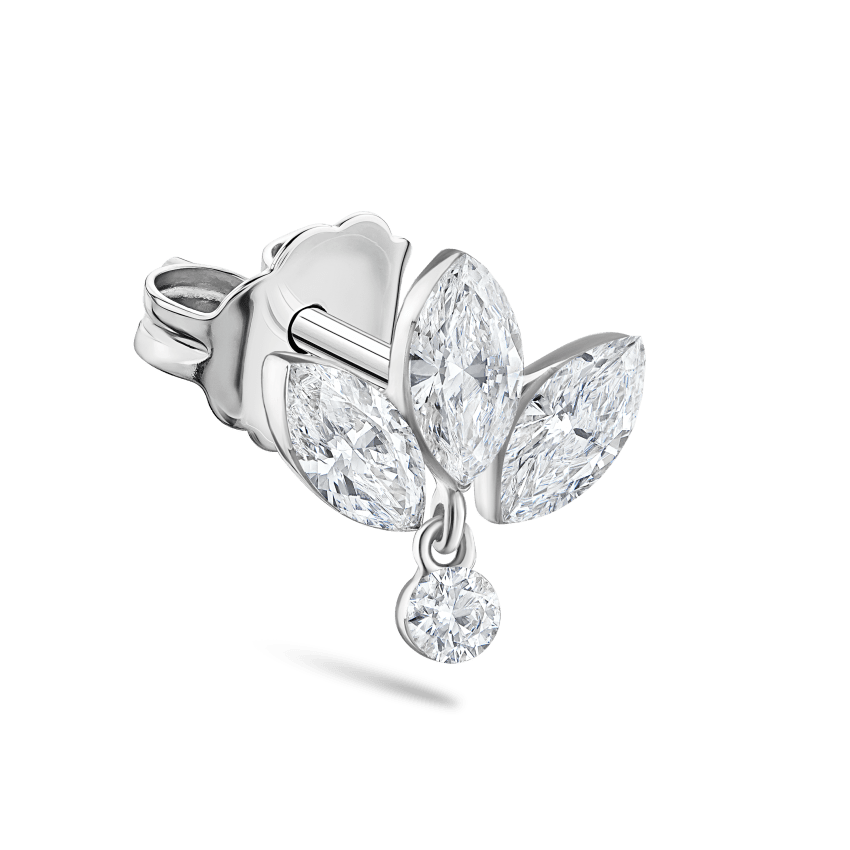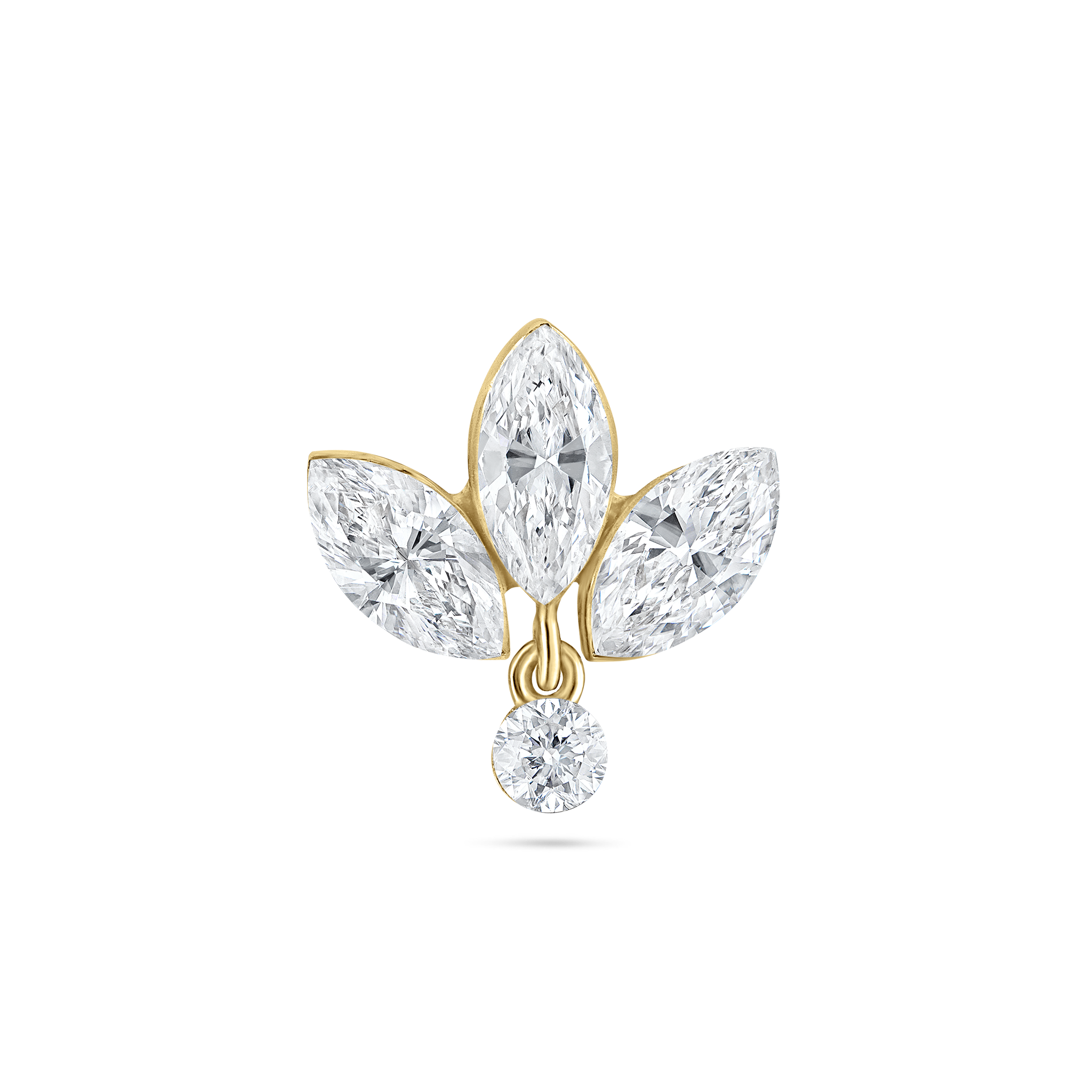 Three luminous marquise diamonds set in solid gold fan out like the petals of a lotus, while a smaller diamond dangles underneath. A refined and dazzling earstud, the lotus is the perfect centerpiece for a Curated Ear®.