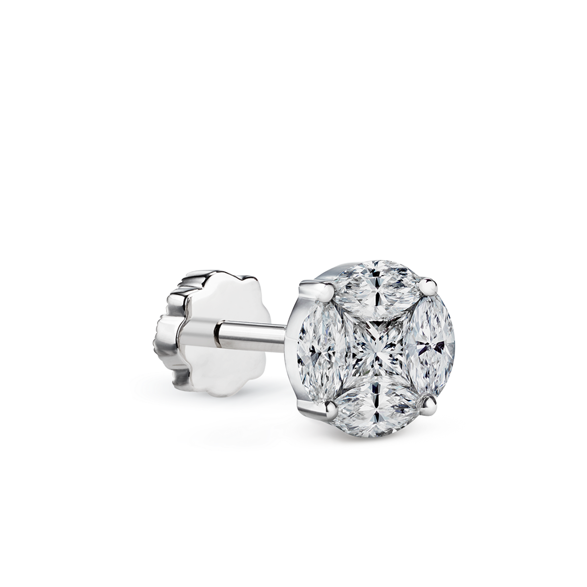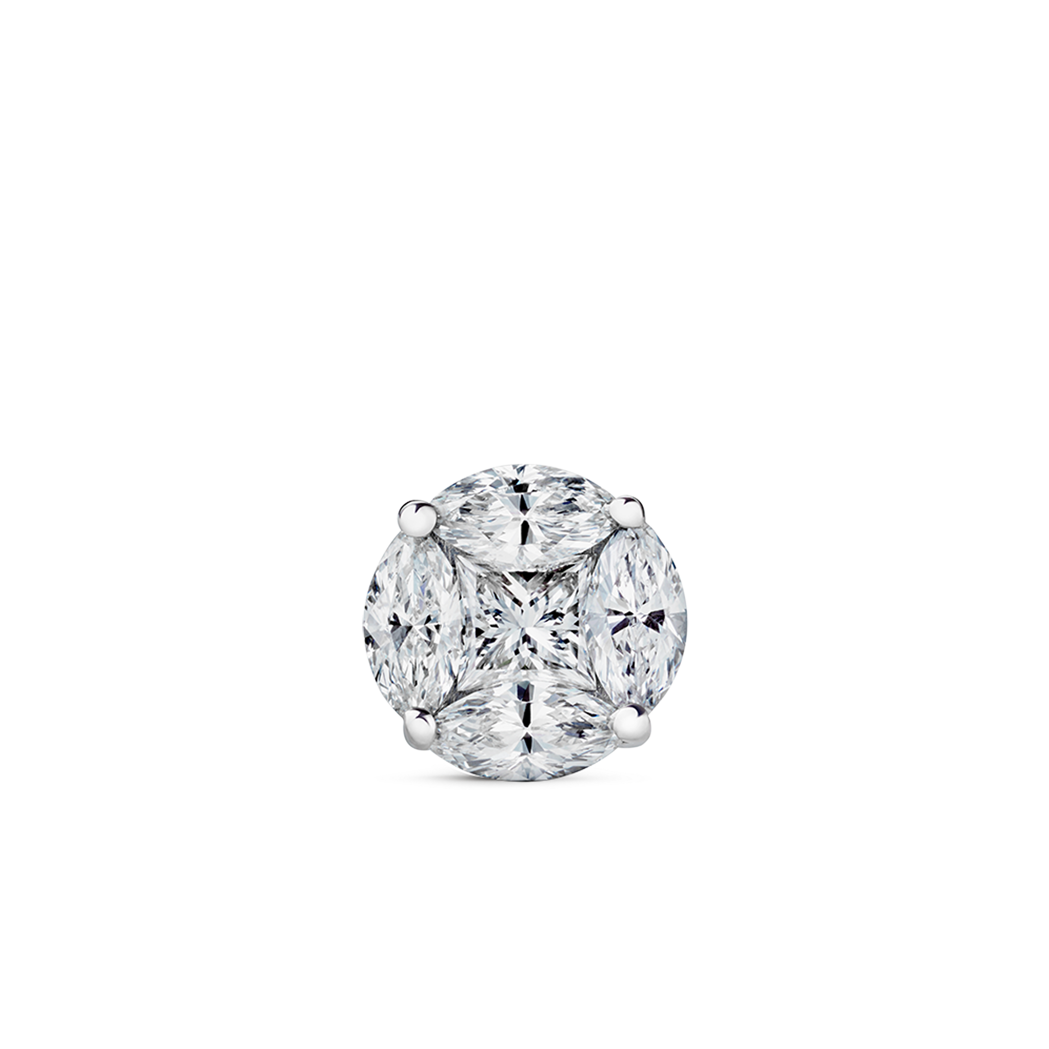 A breathtaking combination of diamonds in solid gold. This round prong set stud features four marquise cut gems framing a center princess cut, giving the appearance of one large stone. With a low rise and flat bottom, this stud sits close to the skin for seamless, comfortable wear.