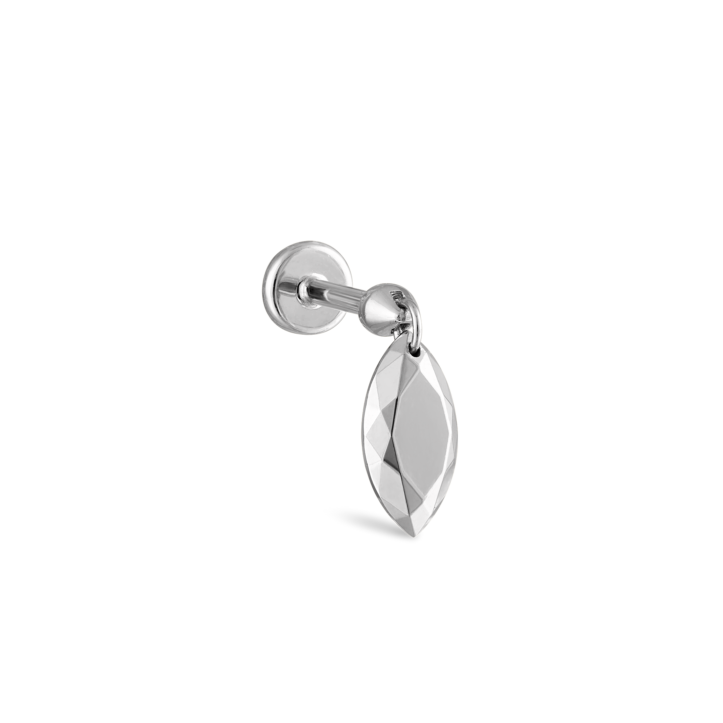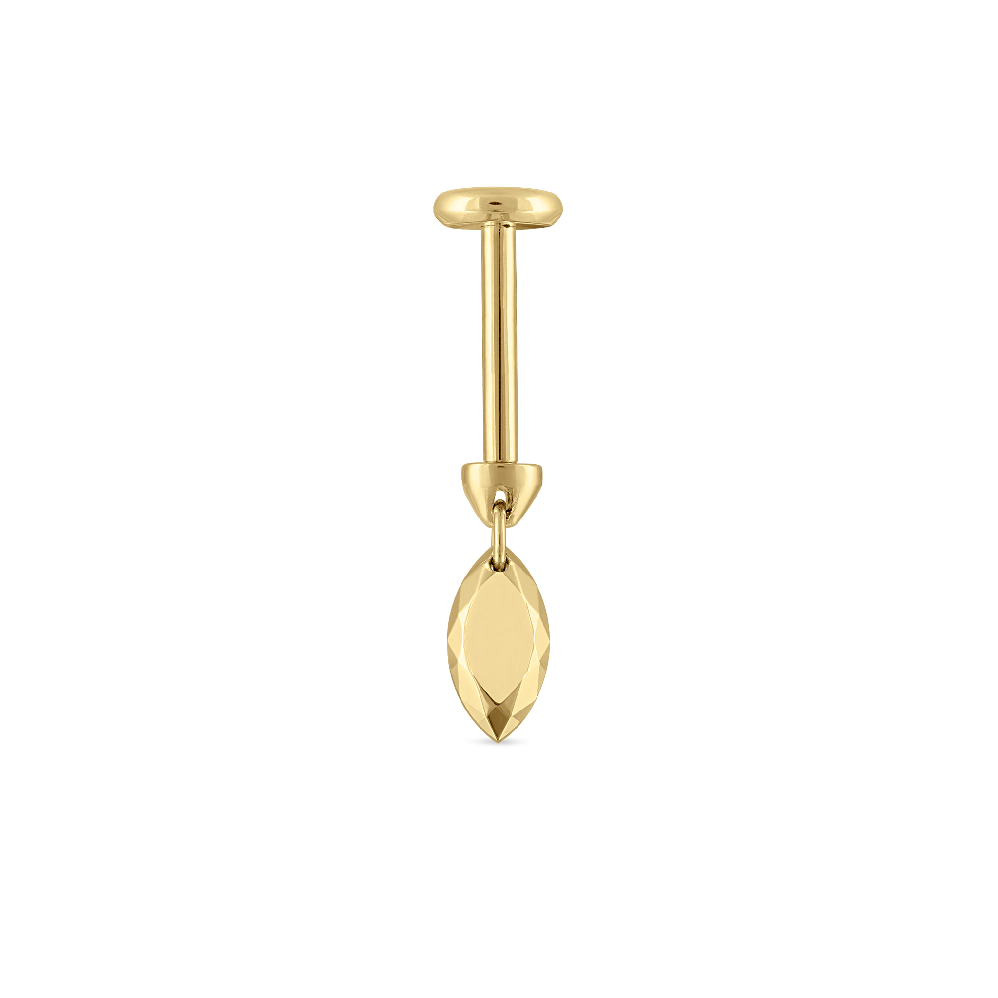 Thoughtfully designed to sit close to the skin, this sleek solid gold faceted style appears to naturally float on the ear thanks to a discreet jump ring mechanism that grants subtle motion. Meticulously engineered with the faceting of a marquise cut diamond, the 3D design captures the essence of the stone while offering a modern alternative that allows for beautiful light reflection from all angles.