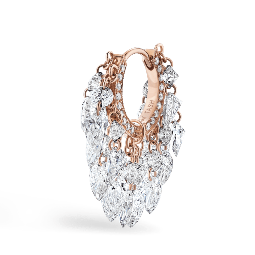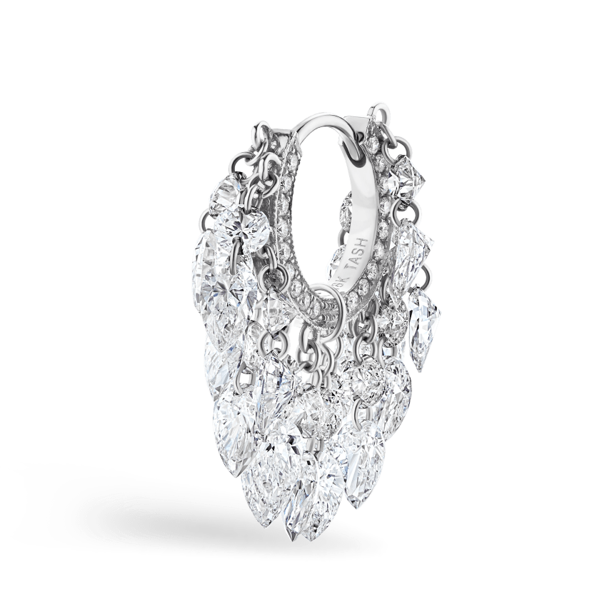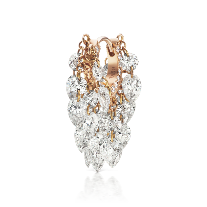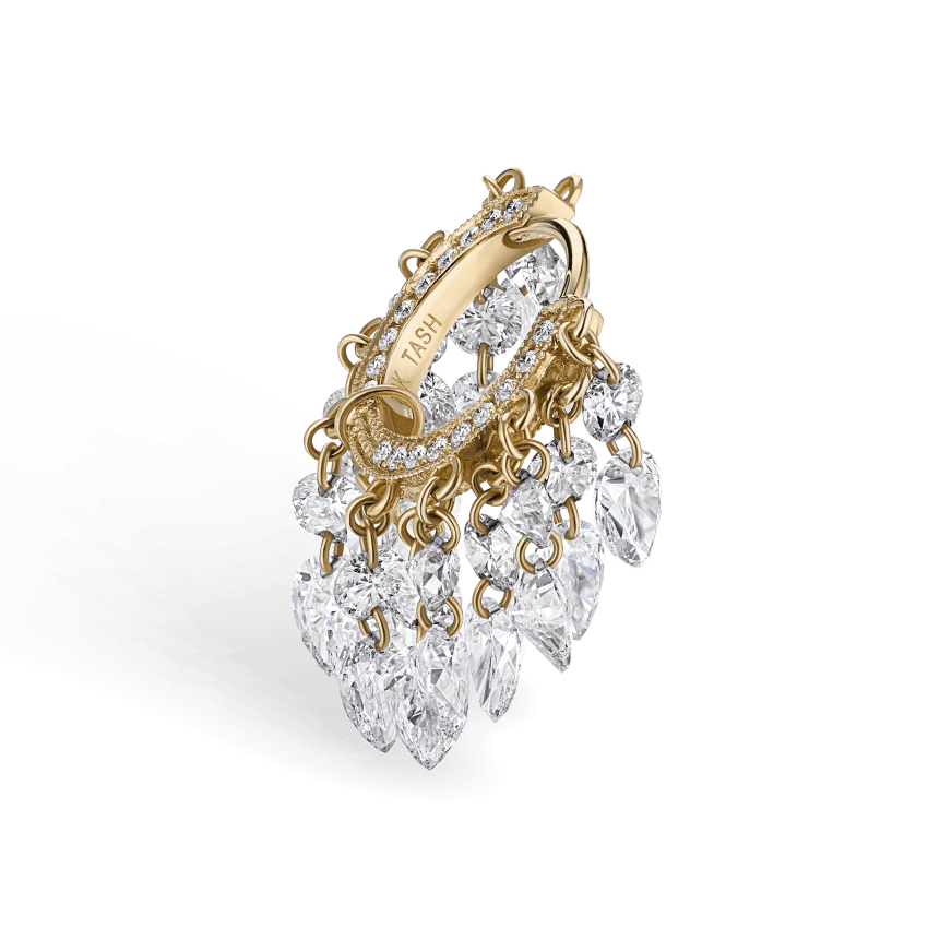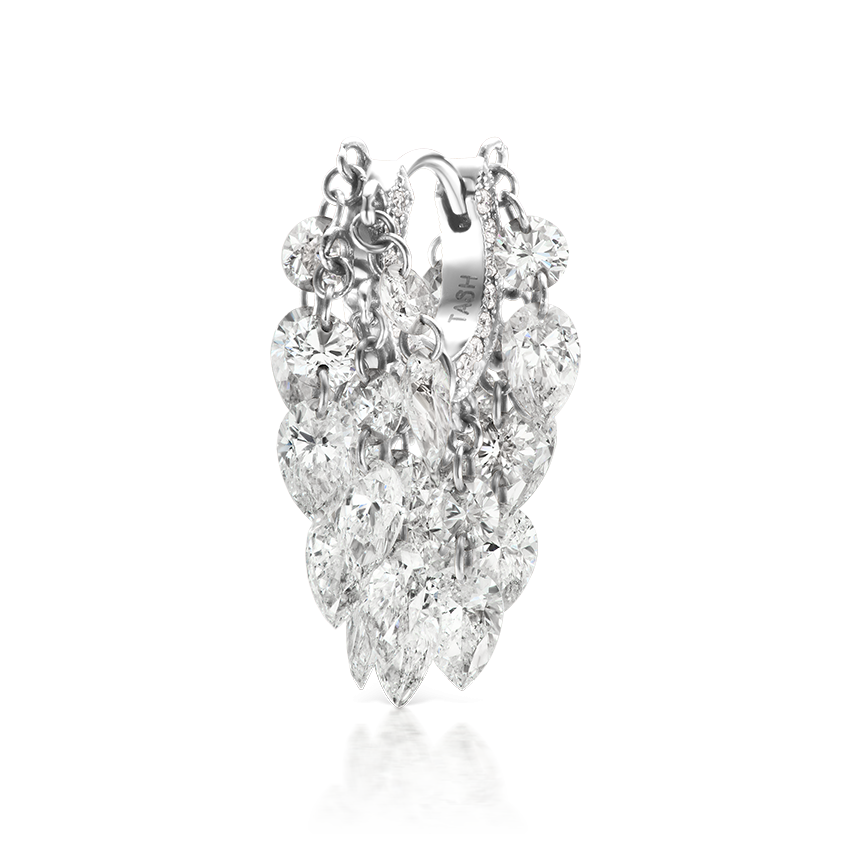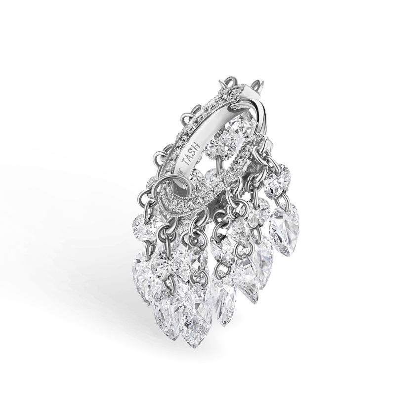 A breathtaking combination of brilliant round and pear floating diamond tassels cascades from the outer surface of this luxurious, patented ring to deliver a waterfall of shine. A diamond pavé solid gold hoop adds an extra level of detail.