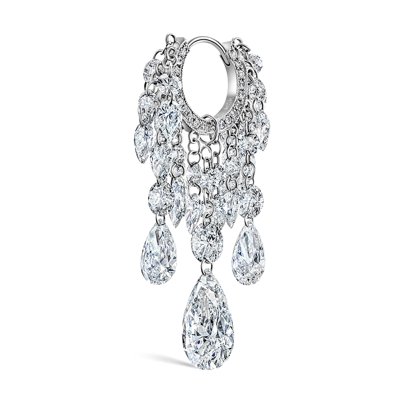 The iconic floating diamond tassel, elevated. A breathtaking combination of 73 brilliant round and pear gems cascade from an 8mm solid white gold pavé ring. Two dangles with floating pear and round diamonds flank a longer center dangle featuring a suspended round connected to a showstopping center pear. Together, they create a spectacular waterfall of shine.