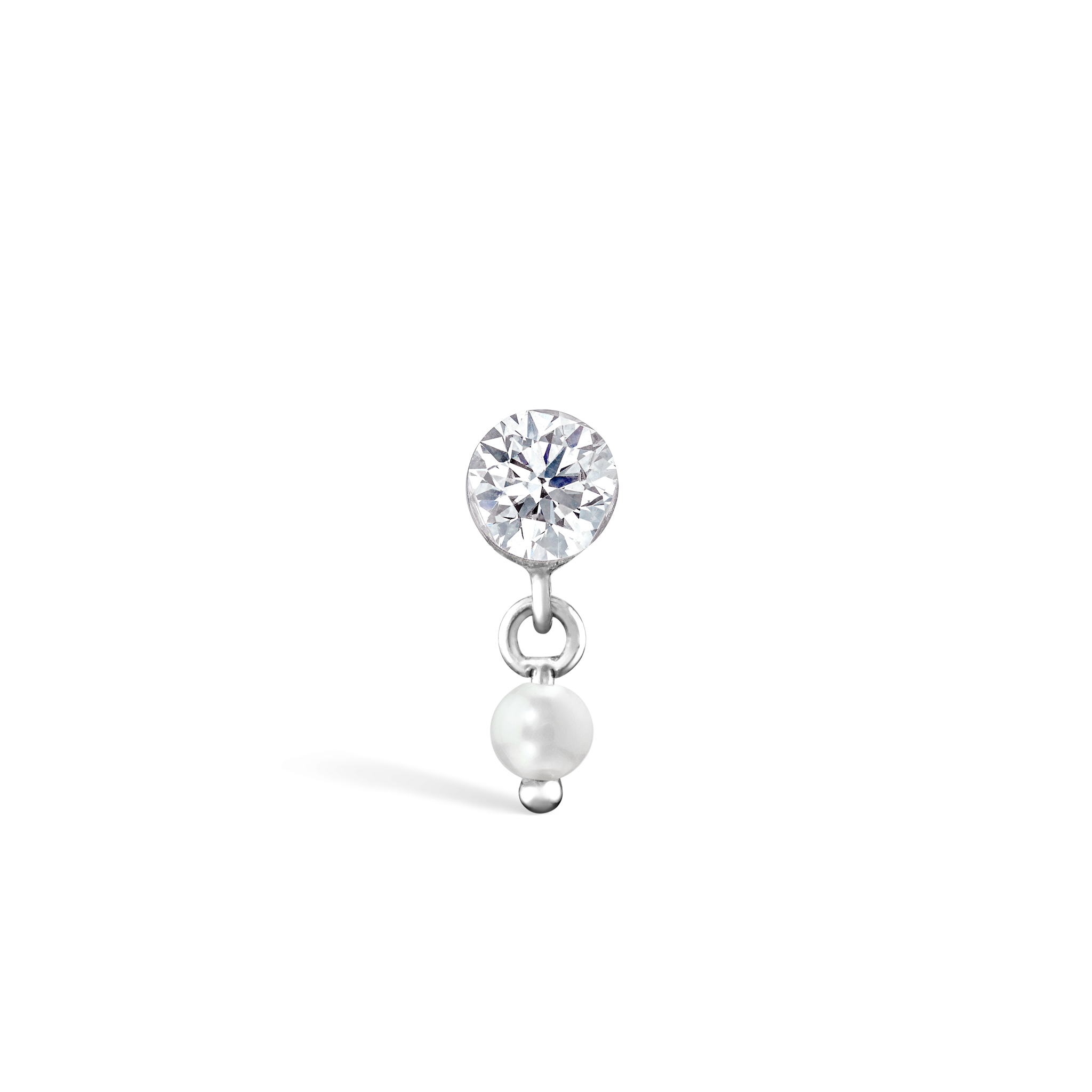 This elegant piece features a small pearl dangling gently from a round diamond. A solid gold invisible setting gives the diamond pristine sparkle while the pearl offers a touch of movement. The combination of timeless gemstones makes this stud an instant classic.