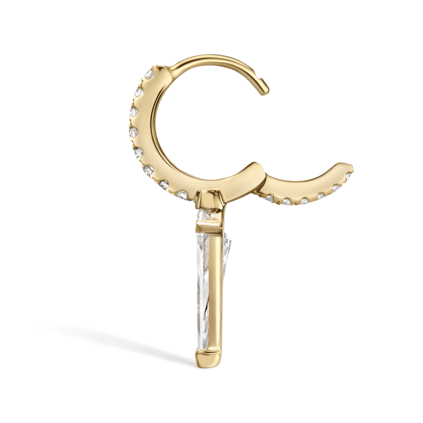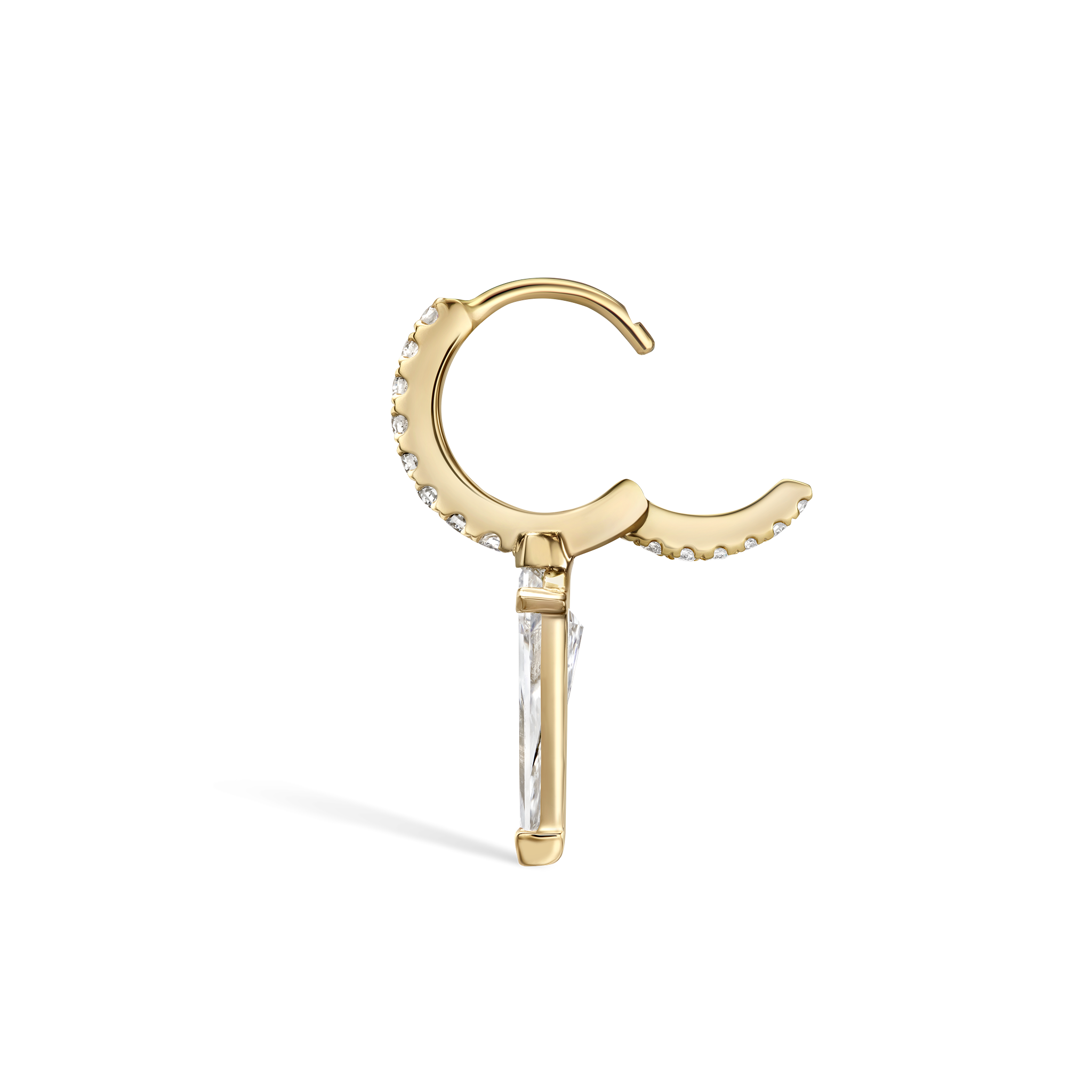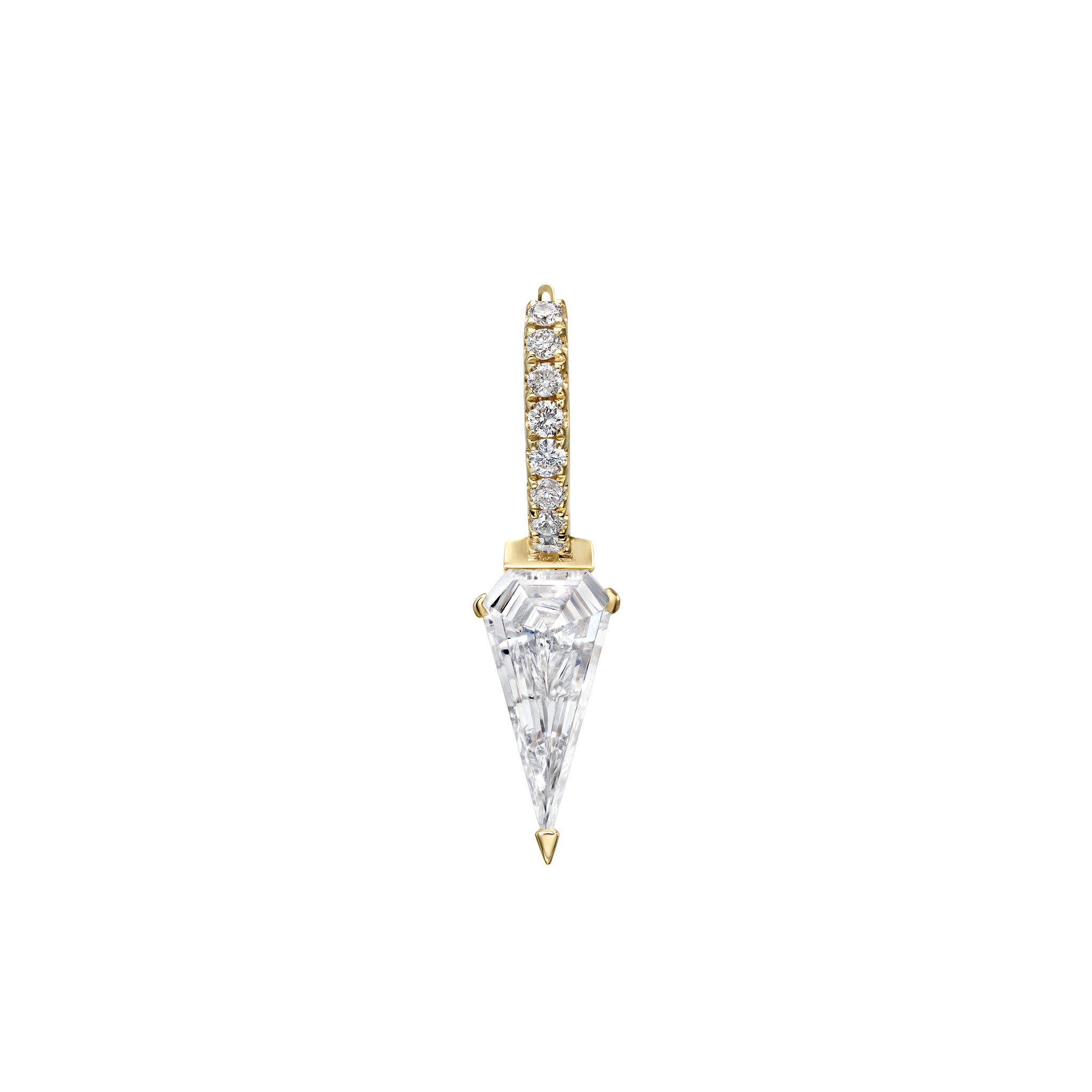 A luxurious upgrade to our iconic spike design. This patented style features a single long silhouette diamond suspended from a classic 6.5mm solid gold eternity hoop. Maria developed and perfected this unique diamond shape that makes a striking addition to the Lobe.