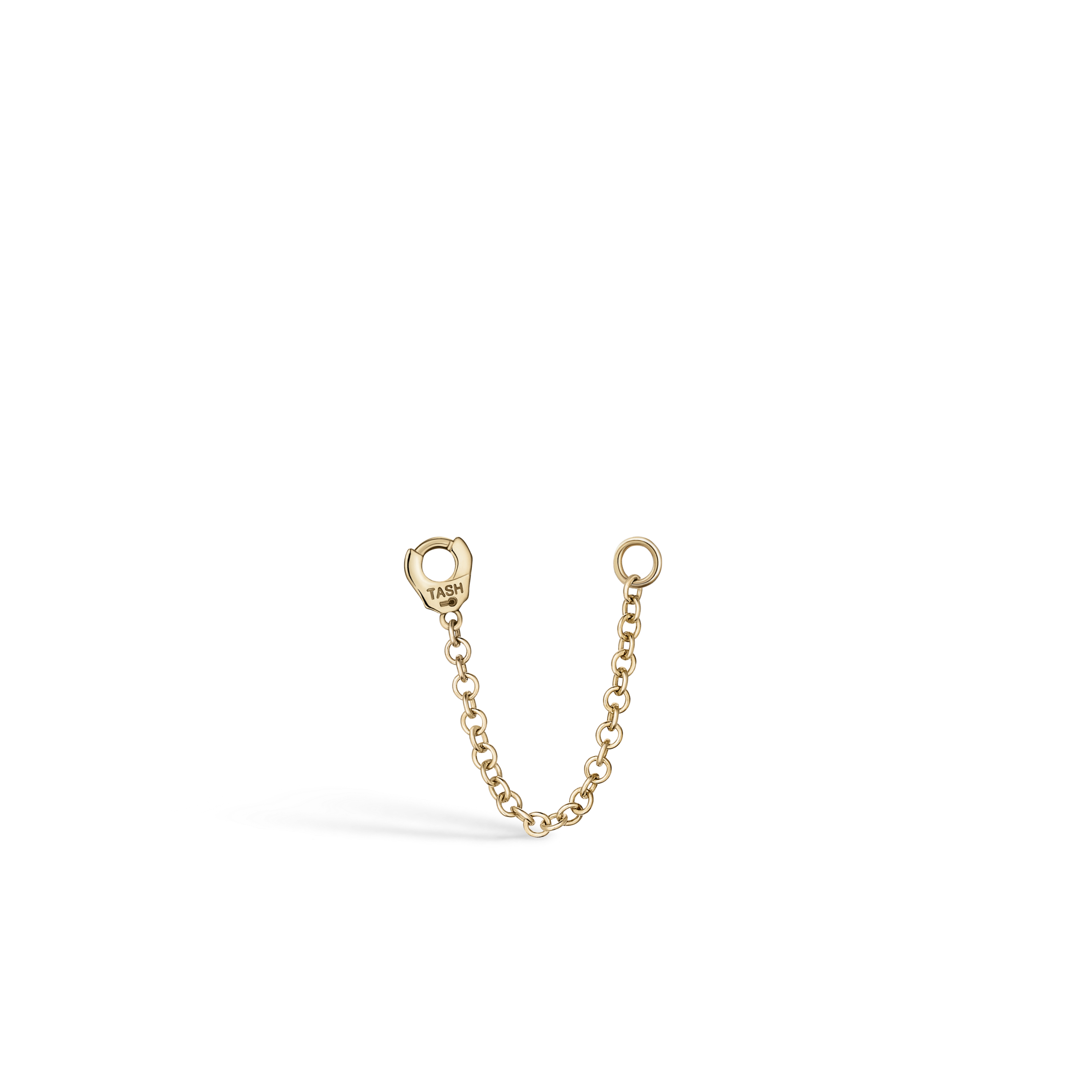 Endless possibilities and pairings with this patented solid gold chain that includes a MARIA TASH branded handcuff jump ring on one side and a plain jump ring on the other. Connect two different piercings or wear front to back of any earring to create a chainwrap look. This versatile piece can also be worn across the nose to connect nostril piercings.