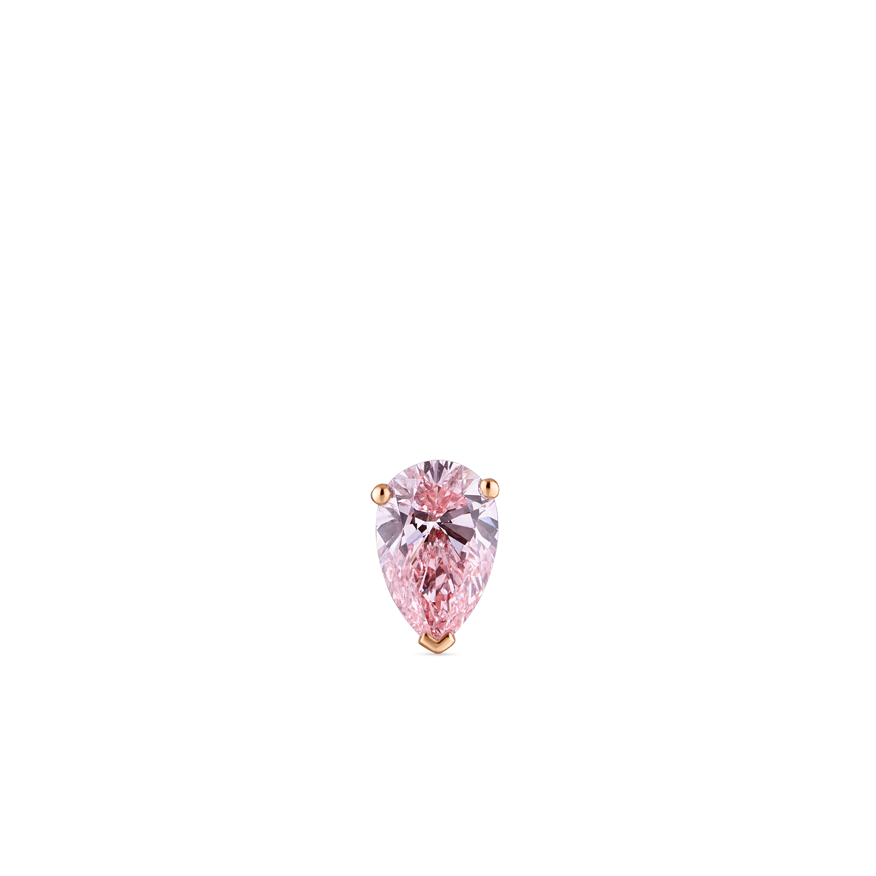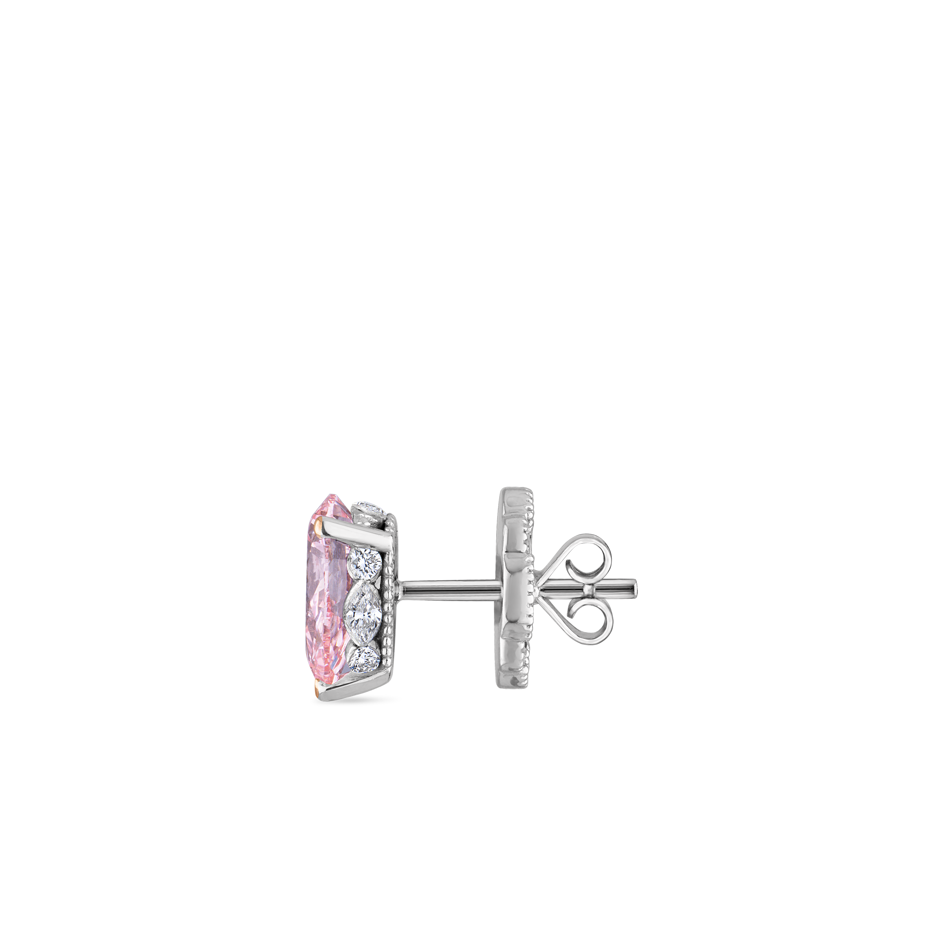 A showstopping large pink diamond stud in a pear shape set in solid gold. Rose gold prongs to enhance the color of the pink diamond while remaining discrete. A detailed milgrain bezel setting featuring invisible set round and marquise stones adds a layer of shine from the side.